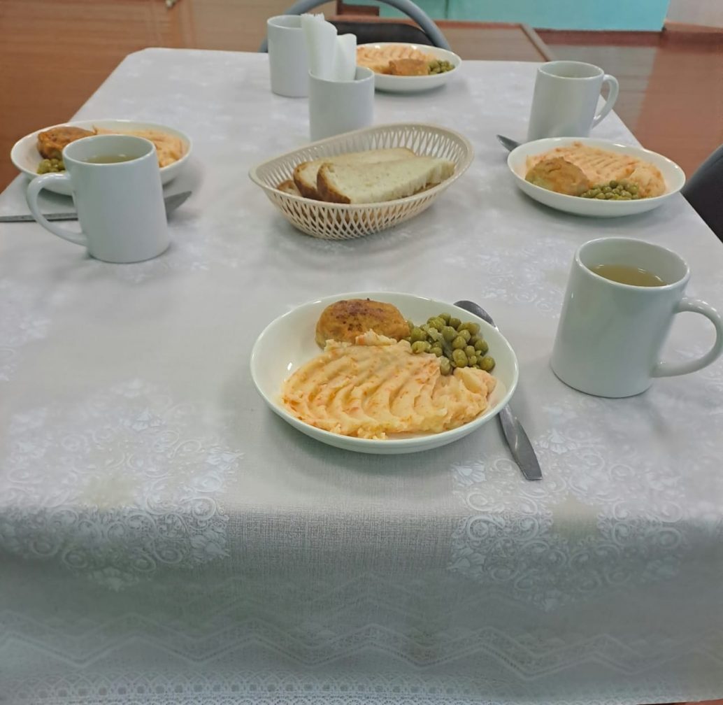 29.11.2023г. Меню:суп гороховый, картофельное пюре, мясная котлета (говядина), салат из свежих овощей, чай, кондитерские изделия, хлеб.