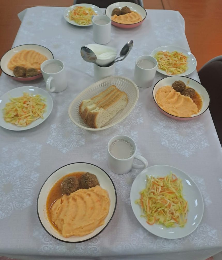 27.11.2025г. Меню: тефтели рыбные, соус молочно- томатный, картофельно- морковное пюре, подгарнировка зелёный горошек, напиток Денсаулык, хлеб.