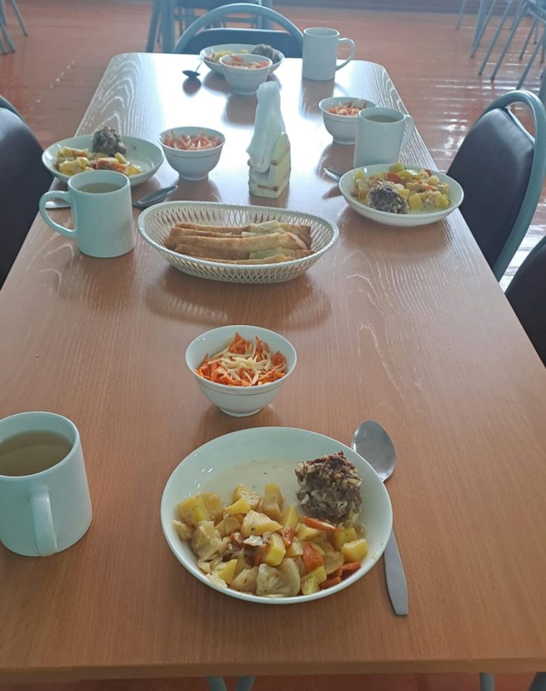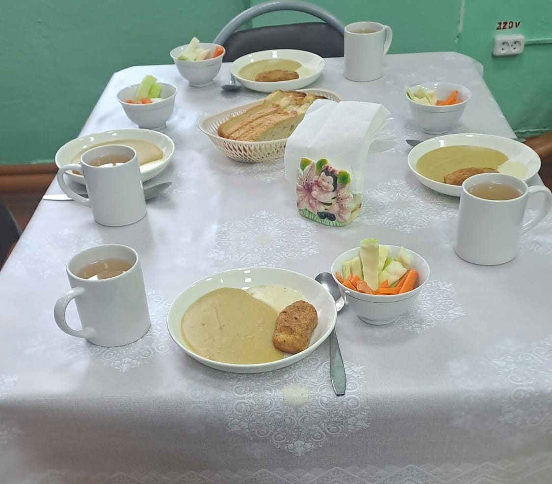 08.05.2025г. Меню: салат из белокочанной капусты и моркови, уха из горбуши, чай с лимоном и сахаром, хлеб, мёд.