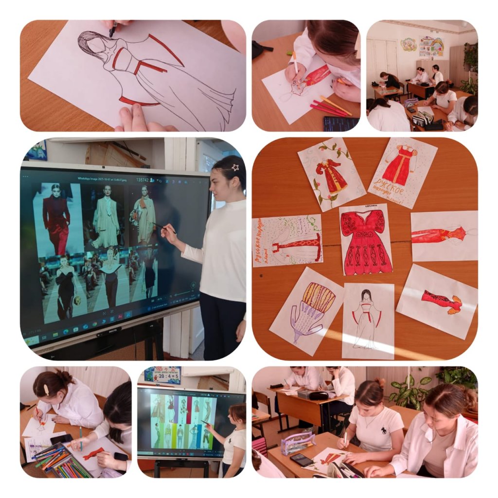 Эстетика бағдарламасының онкүндік жоспары аясында Новобратское ауылындағы Ош мемлекеттік университетінің 8-сынып оқушылары «Халық үлгілеріне негізделген сән дизайны» тақырыбында көркемсурет сабағын өткізді. Киім өндірісі эскиздерден және дизайнға қажетті материалдарды таңдаудан басталады. Эскиз және дизайн идеяларын кез келген жерден салуға болады. Оларға табиғат құбылыстары, әлеуметтік оқиғалар немесе шынайы өмірдегі заттар кіруі мүмкін. Бір сөзбен айтқанда, дизайн жасау - бұл зерттеу процесі. Көптеген фотосуреттер мен иллюстрацияларды қарап шыққаннан кейін біз жұмысқа материалдар мен жабдықтарды дайындадық, киімнің түс схемасы мен пішінін талқыладық және дерексіз коллаж жасадық. Содан кейін біз өз ойларымызды қағазға түсіреміз.